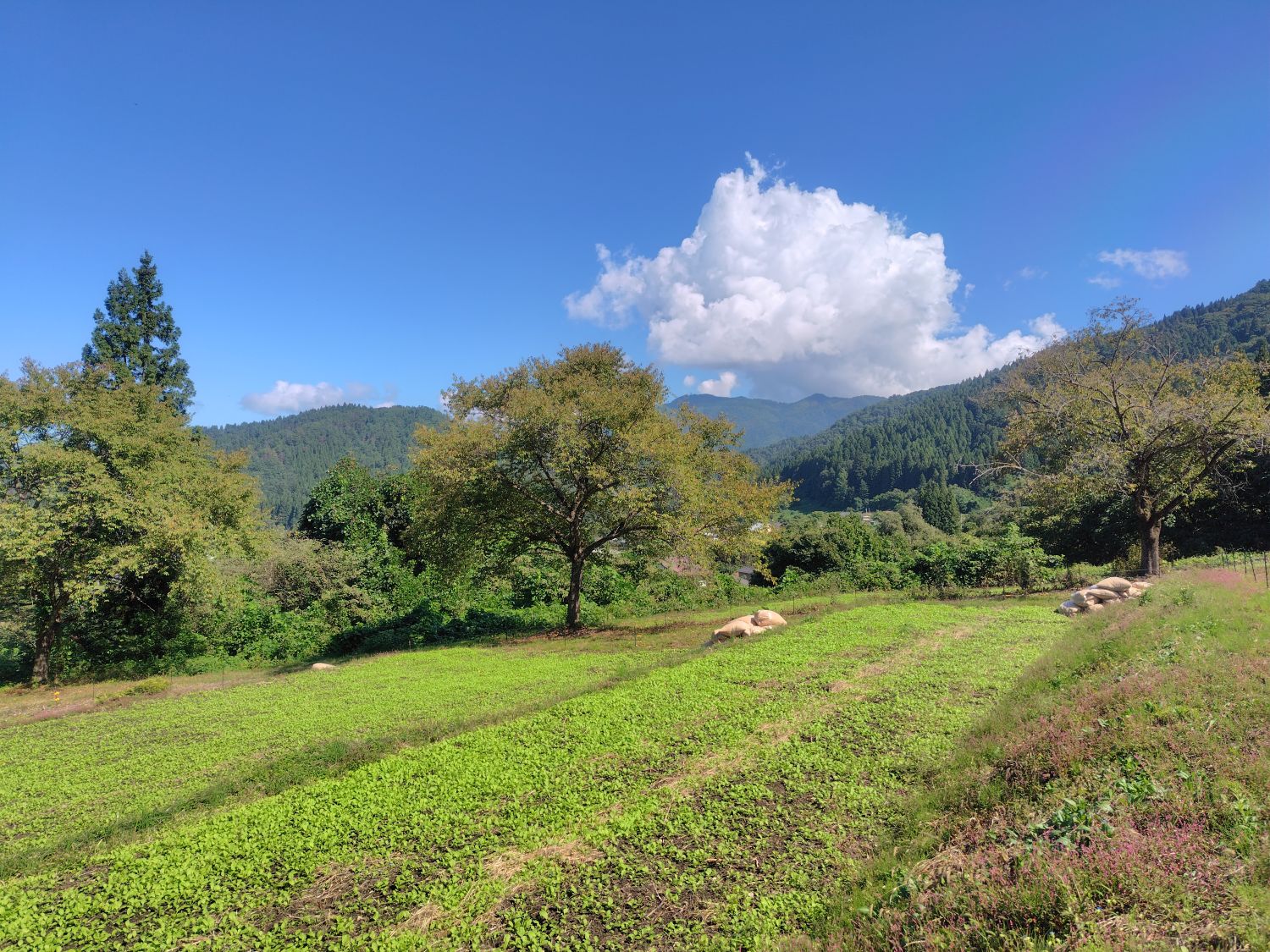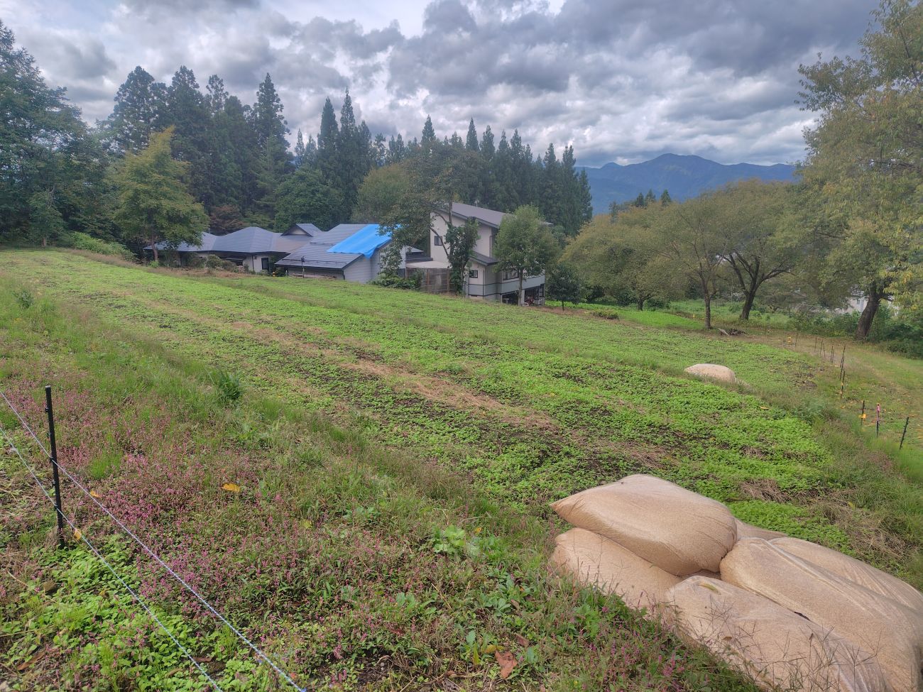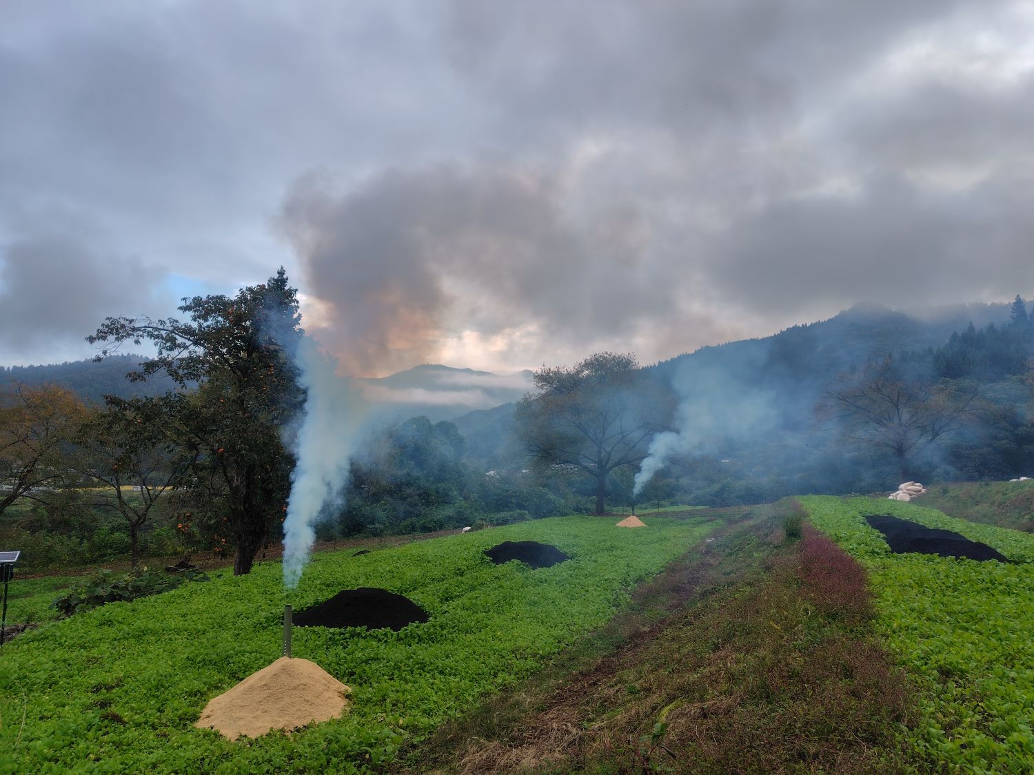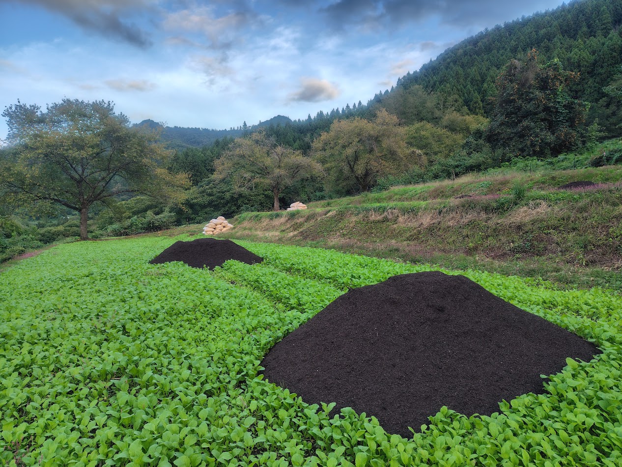 9月も最終日、連作障害を防ぐため、1週間前に蒔いた菜種が紅花畑に広がりました。もみ殻も運び燻炭焼きの準備です。