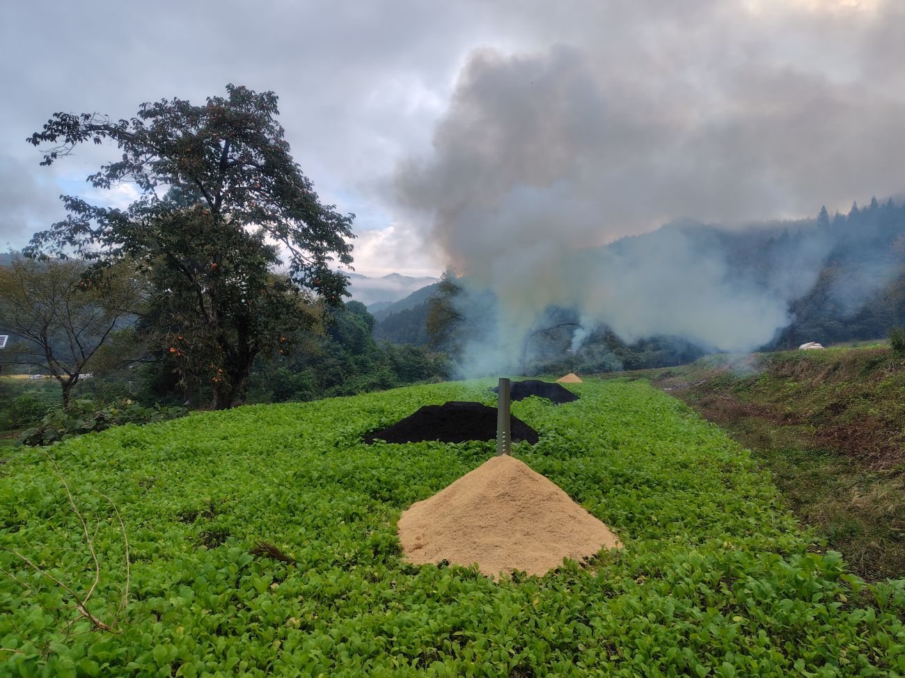 土づくりの最後は糠を焼いてすき込みます。焼ける糠の香りが香ばしい。遠方に白鷹山。